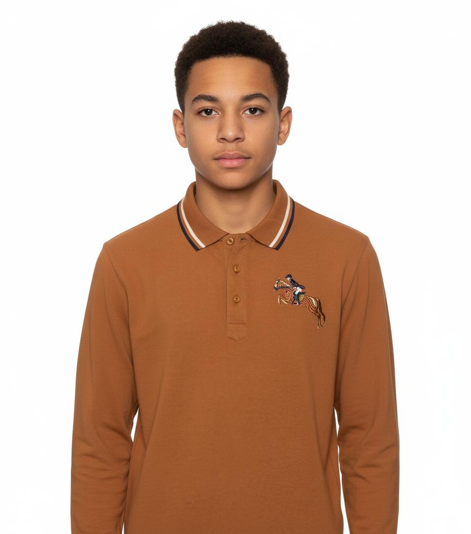 Elevate your casual wardrobe with this full-sleeve men’s polo shirt in a rich orange shade,